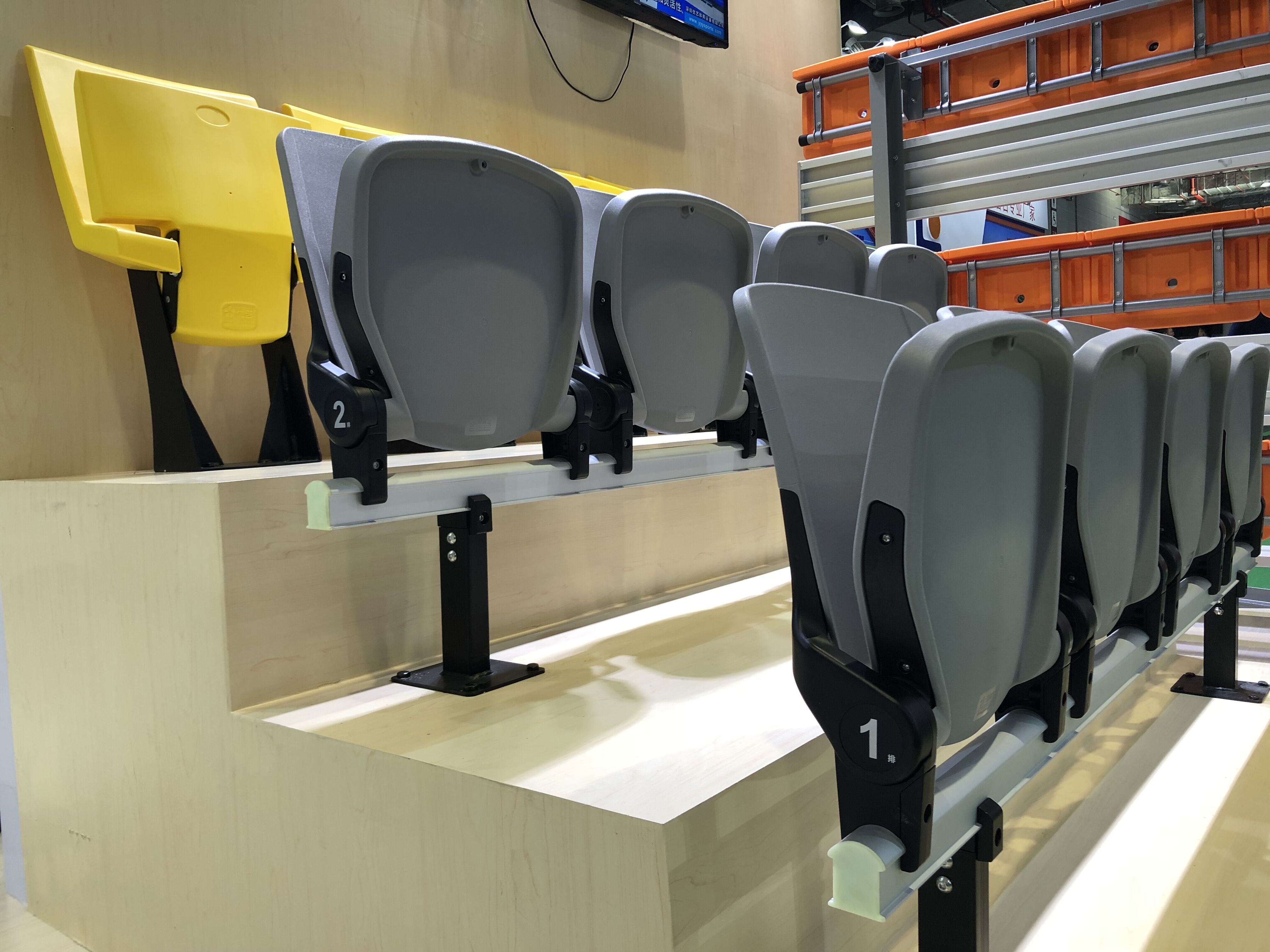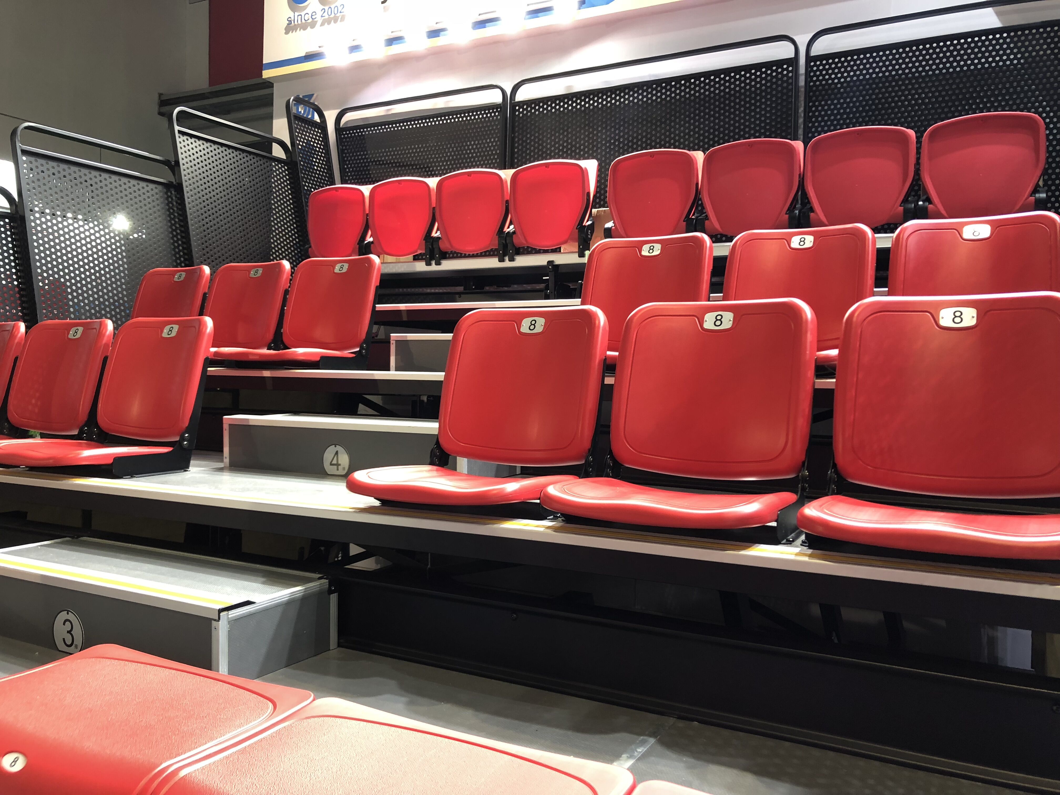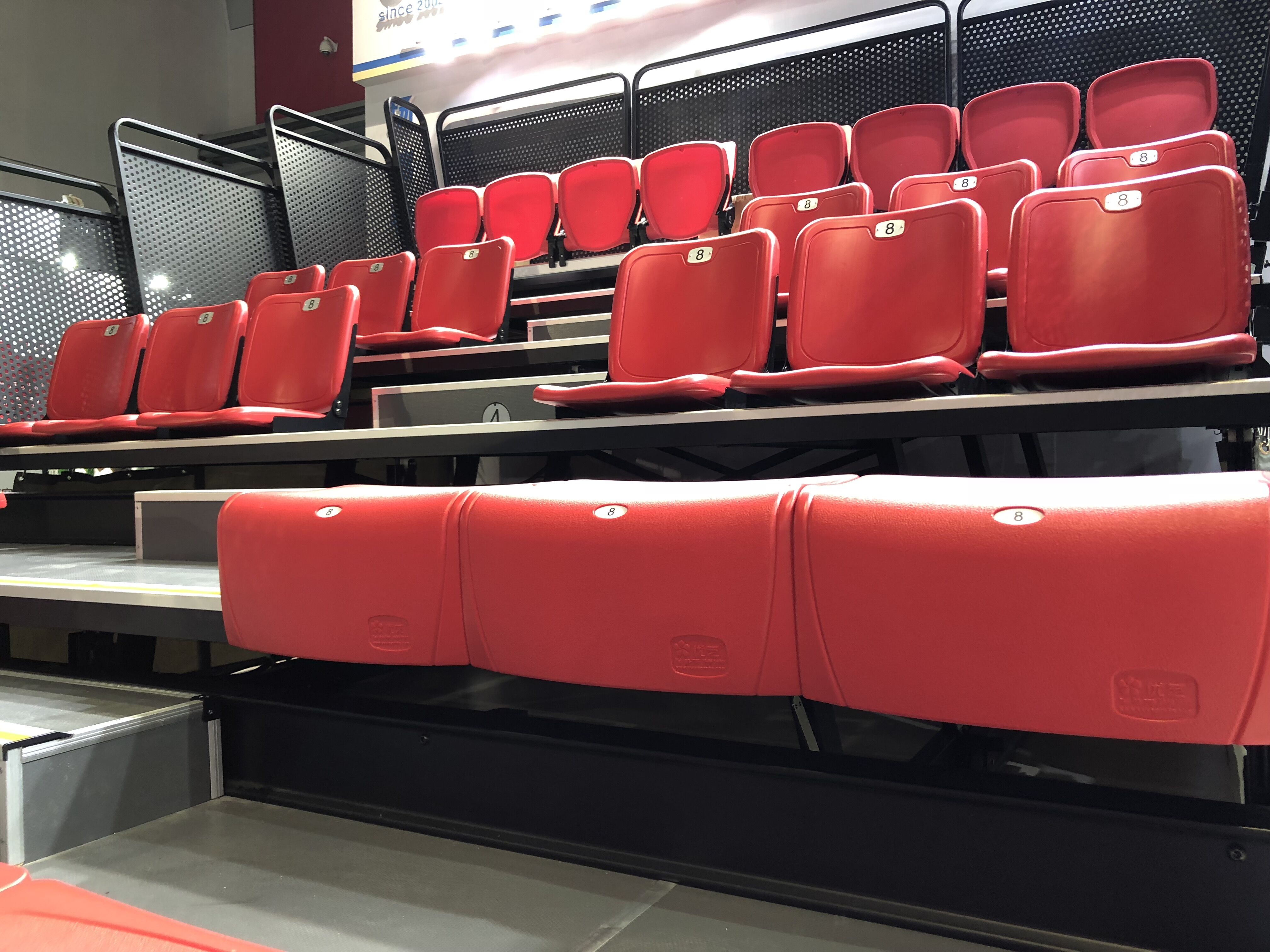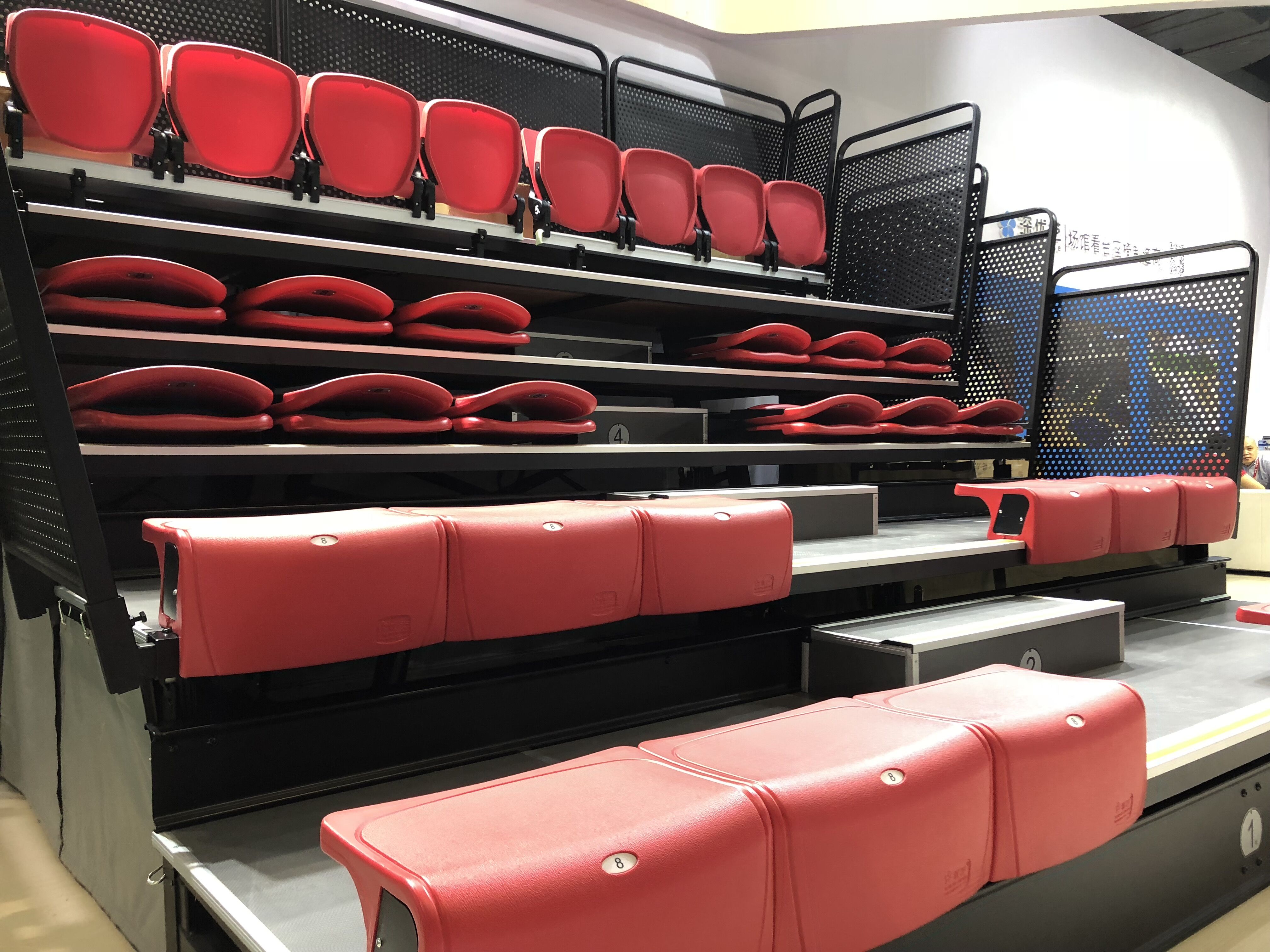 二:移動(dòng)鋁合金看臺(tái)。特點(diǎn):使用方便,便于存儲(chǔ),解決場(chǎng)館運(yùn)用中臨時(shí)增加座位的困難。
