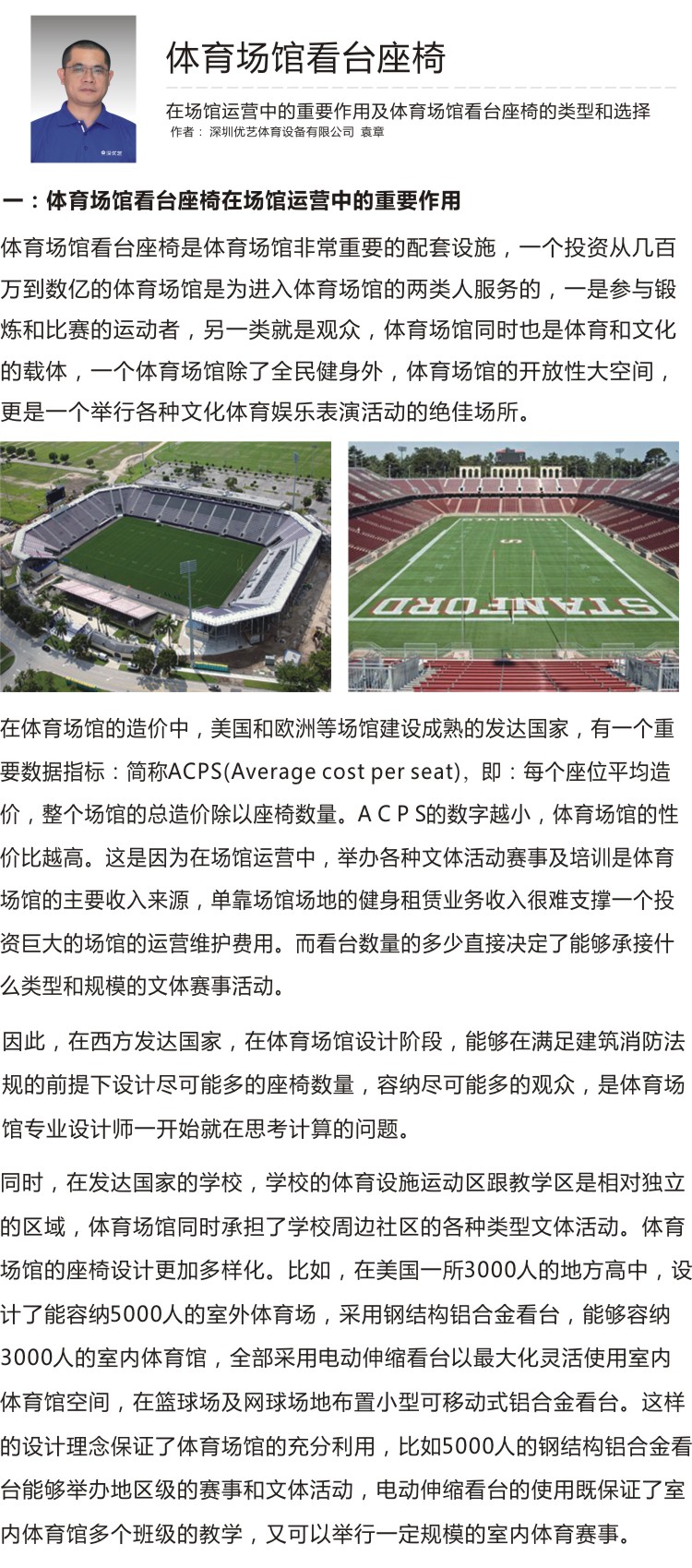 深圳優(yōu)藝體育設(shè)備有限公司總經(jīng)理袁章,以從業(yè)多年角度,對體育場館看臺座椅在場館運營中的重要作用及體育場館看臺座椅的類型和選擇給出了專業(yè)的分析;以下文章已被《中國體育場館設(shè)施設(shè)備優(yōu)選目錄》選用并發(fā)表......